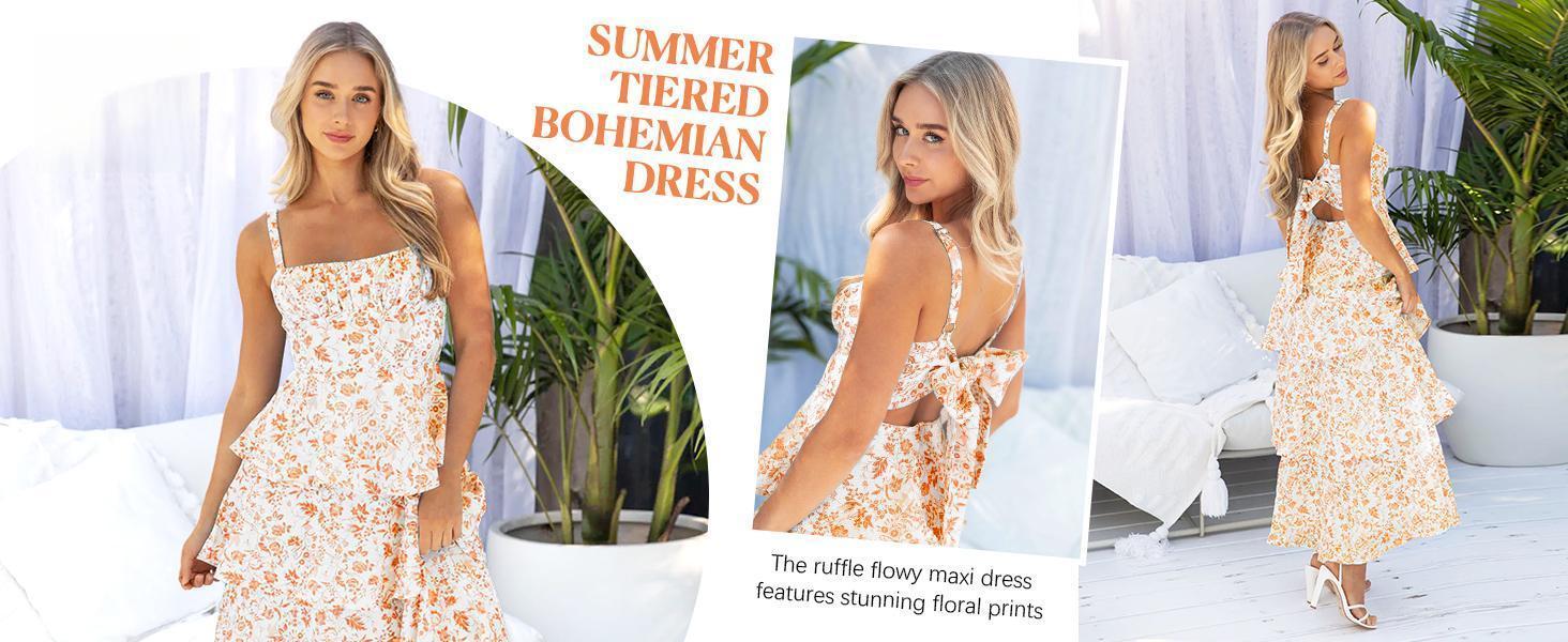 - The ruffle flowy maxi dress features stunning floral prints that add a touch of femininity and elegance to your summer wardrobe. With a variety of vibrant eye and-catching floral patterns to choose from, you can find the perfect dress that showcases your personal style and embraces the of beauty nature. Whether you prefer bold and blooms colorful or delicate and dainty flowers these, floral prints will make a statement and turn heads wherever you go.